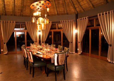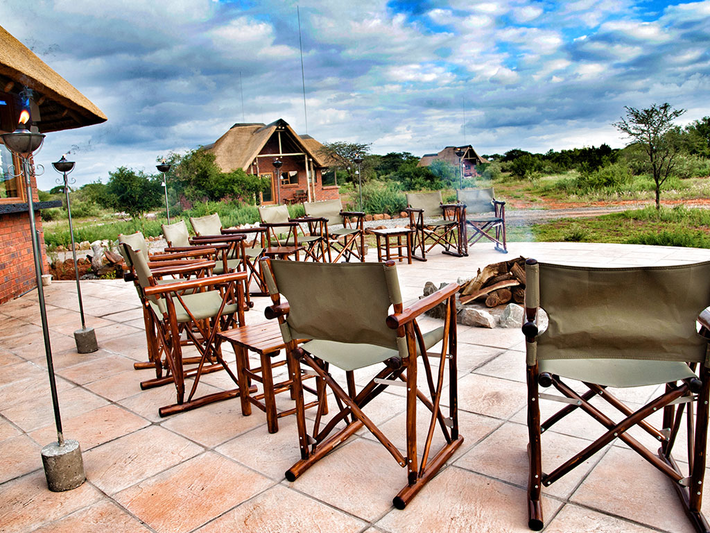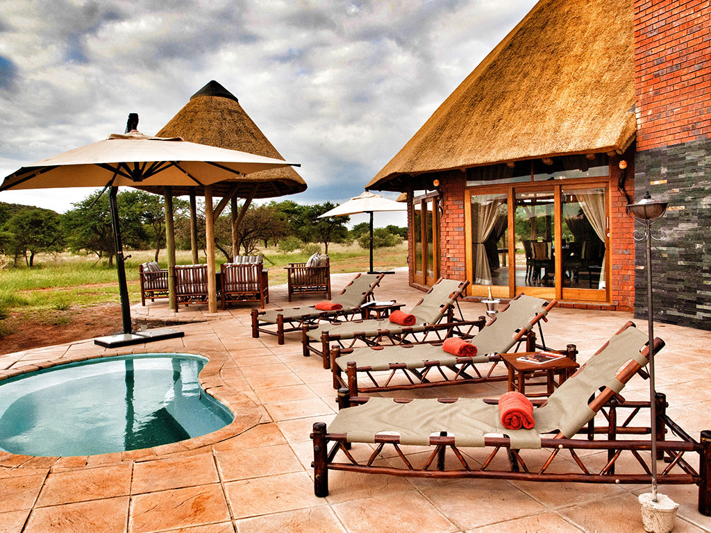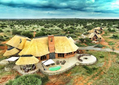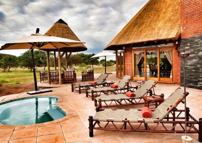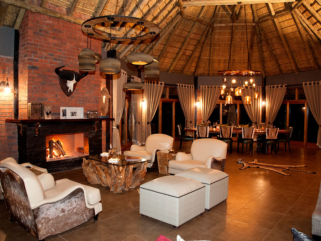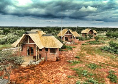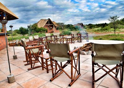 We have 4 separate thatch roofed chalets, each sleeping 2 guests and equipped with their own on-suites, air conditioner, bar fridge and safe. The main area is similarly constructed with an open concept, consisting of a spacious bar area, dining area, and seating areas. Outside is a large patio area equipped with a pool and lounge chairs, a bonfire area, comfortable seating area and dining area. Fresh and delicious meals are prepared daily by our experienced chef and kitchen staff. Game meat is always utilised when possible. The day begins with a scrumptious breakfast. Lunch takes place either at the lodge or with a beautiful set up in the field. The most special time of day is sunset. Sun-downers are either offered at the lodge or in selected scenic spots in the field. A nightly bonfire is tradition and takes place every evening with freshly prepared snacks. Last but not least is dinner, which consists of a 3 course meal, fresh bread and salads.
