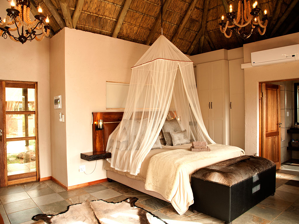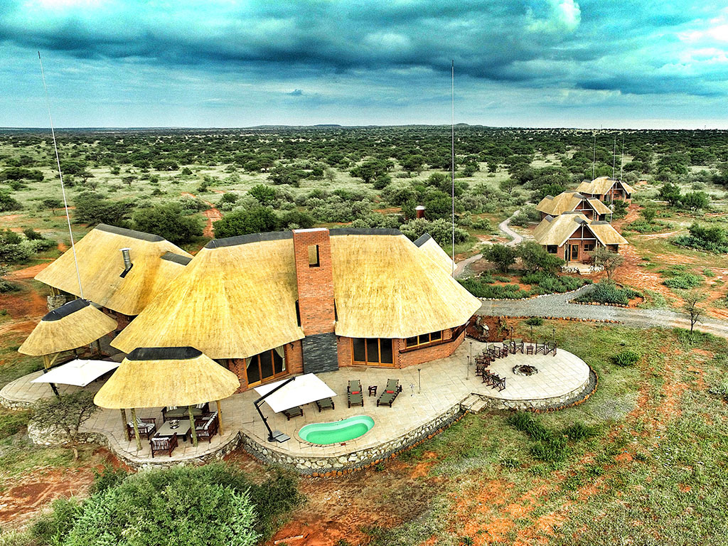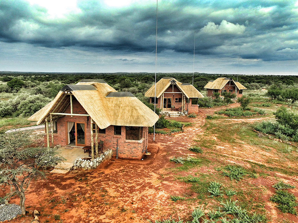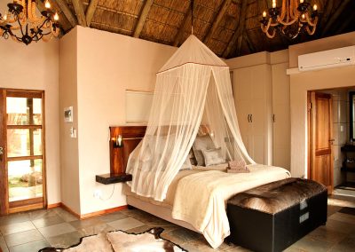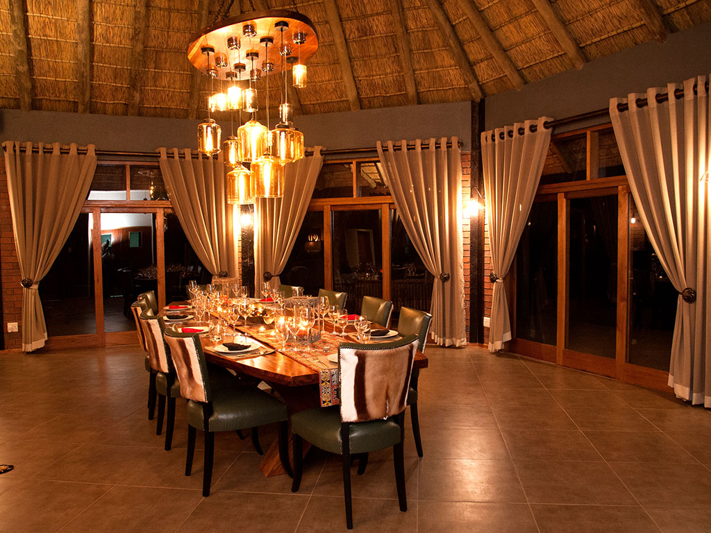We have 4 separate thatch roofed chalets, each sleeping 2 guests and equipped with their own on-suites, air conditioner, bar fridge and safe. The main area is similarly constructed with an open concept, consisting of a spacious bar area, dining area, and seating areas. Outside is a large patio area equipped with a pool and lounge chairs, a bonfire area, comfortable seating area and dining area. Fresh and delicious meals are prepared daily by our experienced chef and kitchen staff. Game meat is always utilised when possible. The day begins with a scrumptious breakfast. Lunch takes place either at the lodge or with a beautiful set up in the field. The most special time of day is sunset. Sun-downers are either offered at the lodge or in selected scenic spots in the field. A nightly bonfire is tradition and takes place every evening with freshly prepared snacks. Last but not least is dinner, which consists of a 3 course meal, fresh bread and salads.